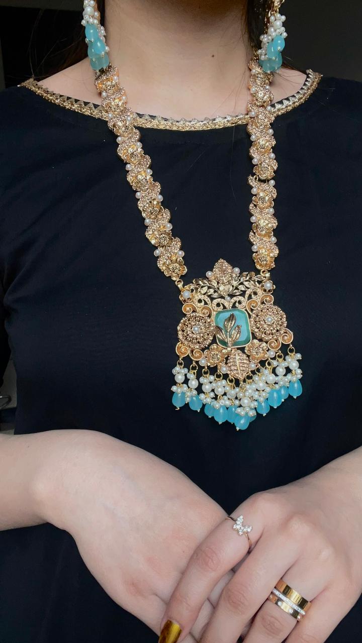 Set includes earrings with sahars teeka maala