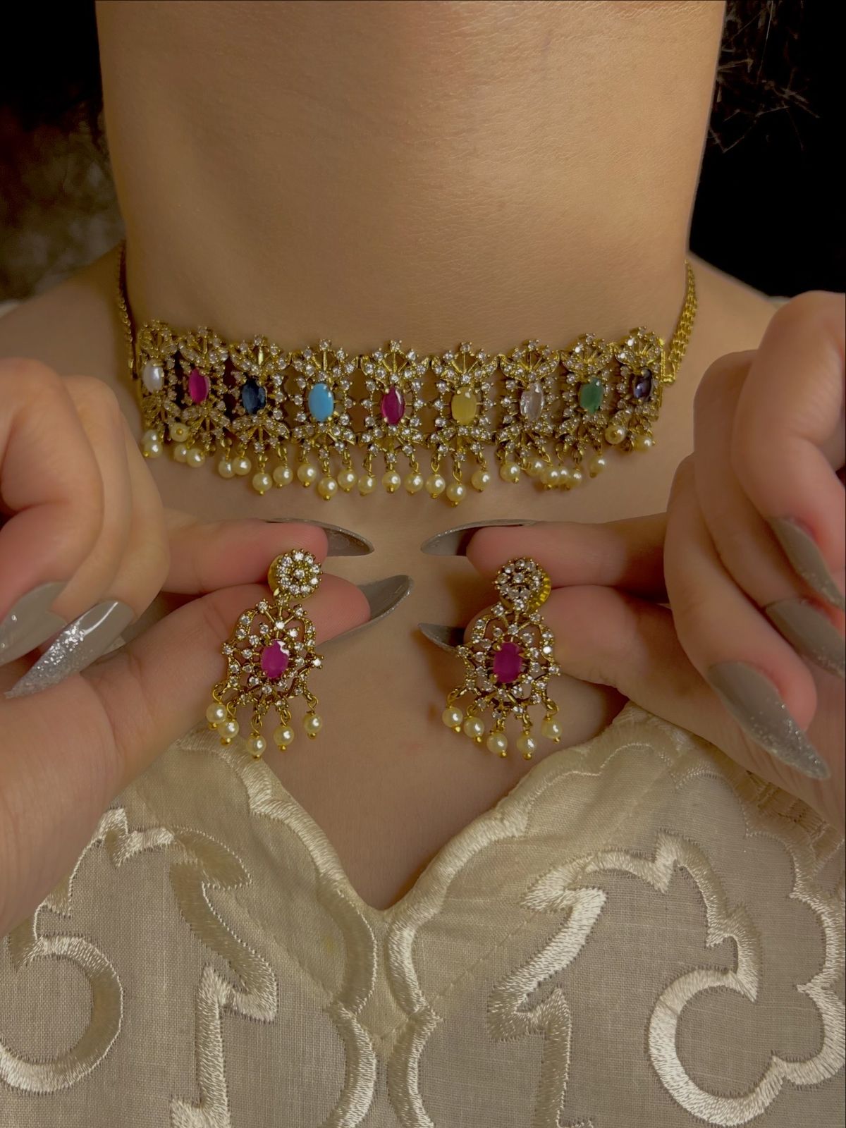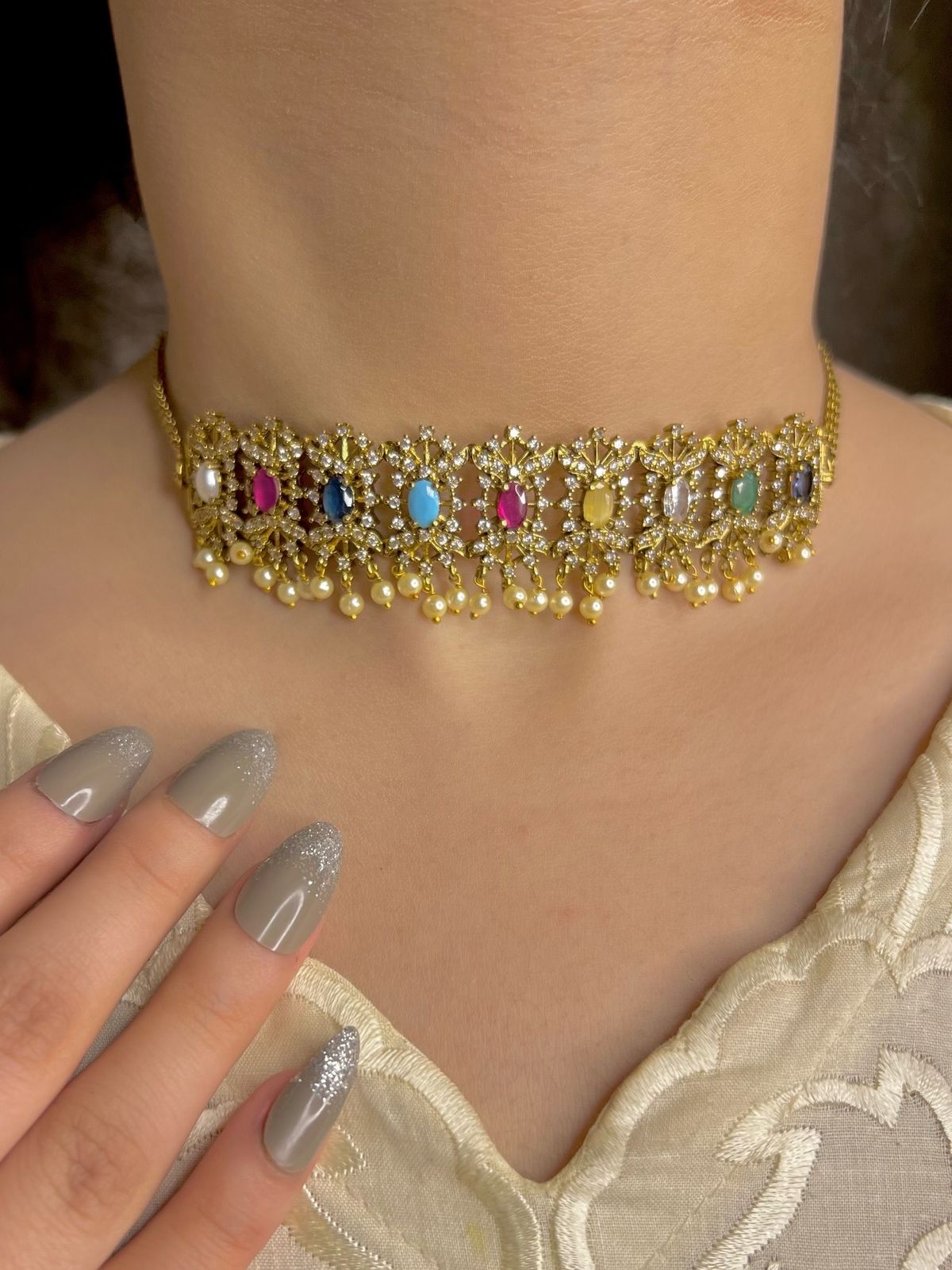 Description indian jarao zircon gokd Plated choker set includes earrings n neck piece colour of product can be slightly vary due to lighting